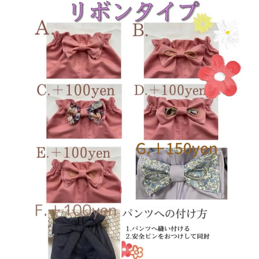 着物のデザインはお写真のモデルさんと同じ黄色のお花柄のもので、パンツ.半襟のお色の選択とリボンのタイプをお選びいただくセミオーダーのページです。